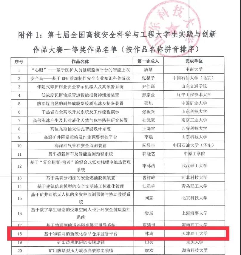 近日,经第33届安全年会组织委员会同意,山东科技大学组织专家于线上举办第7届全国高校安全科学与工程大学生实践与创新作品大赛决赛评审会,经过激烈角逐,我院关文玲老师指导18级安全工程专业学生林涛开展的项目《基于物联网平台危化品仓储系统》在安全工程领域的创新设计作品中脱颖而出,荣获大赛一等奖。
