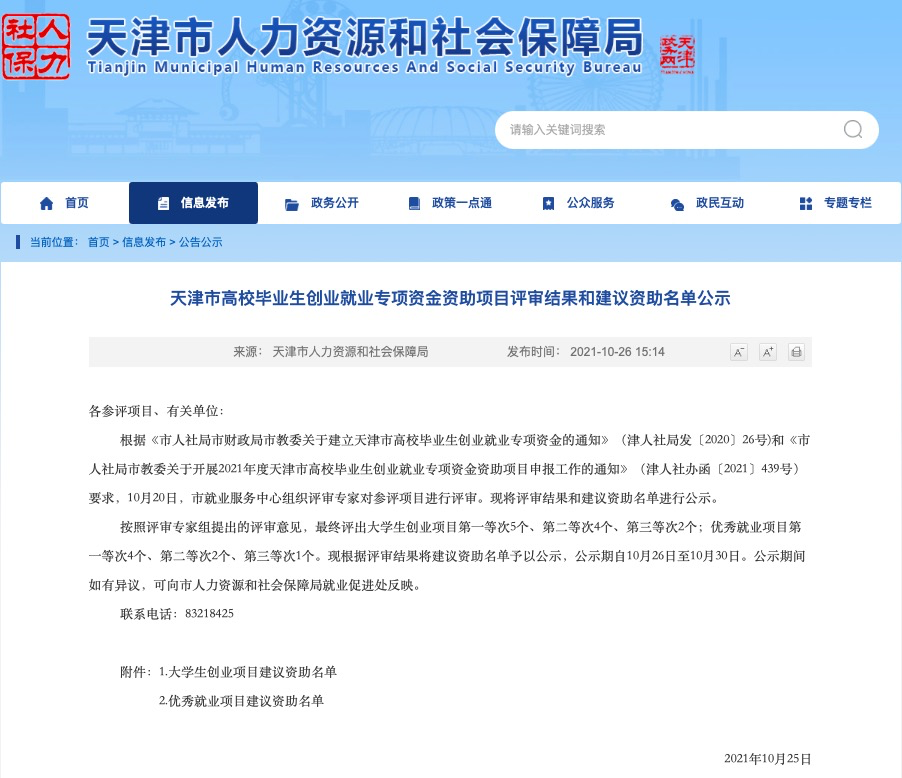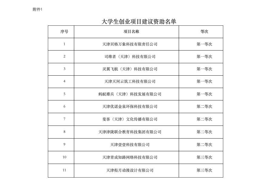 近日,天津市人力资源和社会保障局发布2021年度天津市高校毕业生创业就业专项资金资助项目建议资助公示名单,我校大学生创业项目“天津天河云筑工科技有限公司”被评为第一等次建议资助项目。