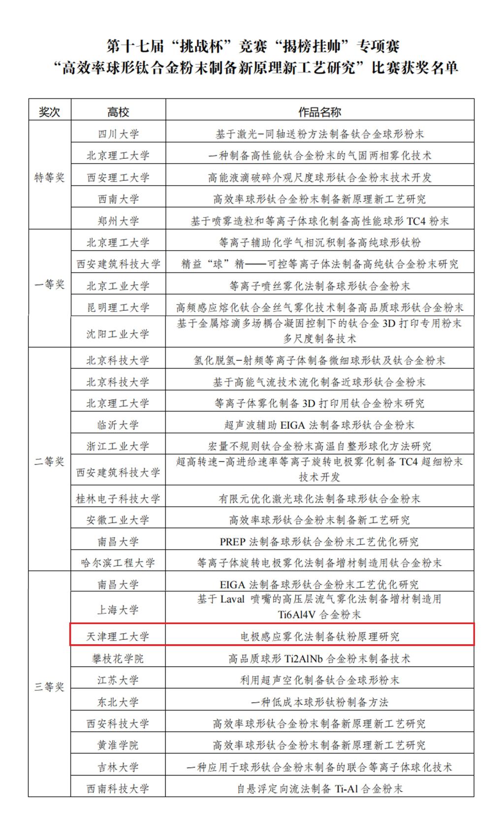 由攀钢集团研究院有限公司、共青团四川省委组织的第十七届“挑战杯”竞赛“揭榜挂帅”专项赛“高效率球形钛合金粉末制备新原理新工艺研究”比赛,经该选题评审委员会资格审查、初审、复审,由我校材料科学与工程学院田银宝老师指导的参赛作品《电极感应雾化法制备钛粉原理研究》荣获全国三等奖。
