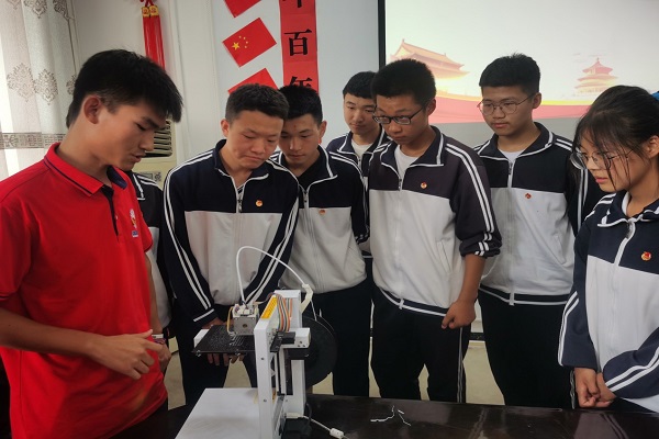 科普扶智,助力乡村振兴。实践队积极投身于乡村教育事业,在天津市教学名穆浩志的带领下,先后在蓟州区罗庄子镇和桑梓镇,为中小学生宣传科学文化知识。实践队成员结合专业特点,为中小学生们展示了扫地机器人、机器狗、3D打印机及第七届全国大学生工程训练综合能力竞赛获奖作品势能小车等一系列科技作品,手把手指导中小学生们与机器人进行互动,近距离体会到科学知识的神奇魅力。
