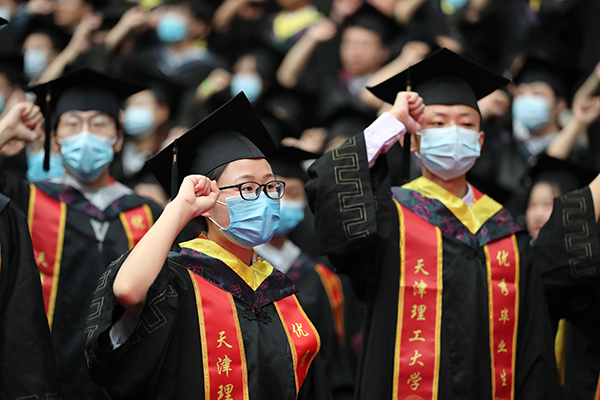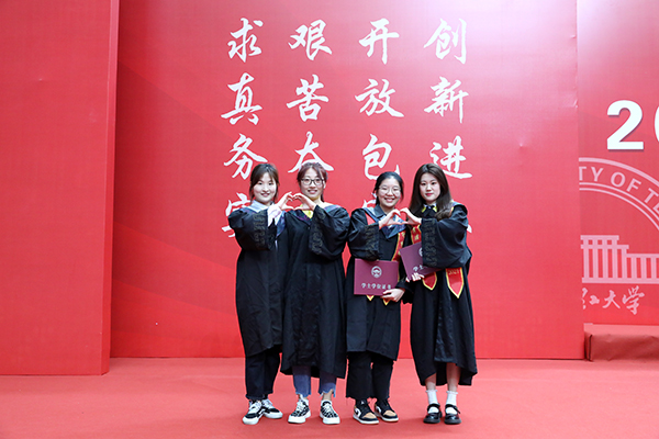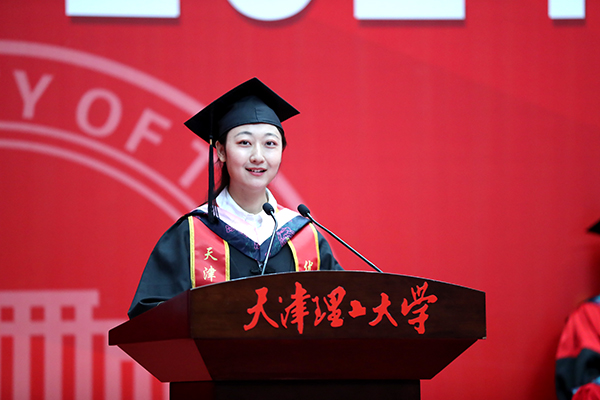 毕业生代表、语言文化学院赵思瑶同学在发言中回顾了四年来在母校成长成才的点点滴滴,感谢母校和老师的培养,并表示天理学子会迎着第二个百年奋斗目标,让青春在不懈奋斗中绽放绚丽之花。她带领全体毕业生做出庄严宣誓:“秉承校训精神,报效祖国,奉献社会,服务人民,为中华民族伟大复兴不懈奋斗。”