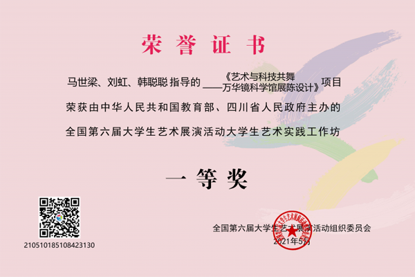 全国第六届大学生艺术展演活动于5月6日至12日在四川成都举行。我校聋人工学院教师马世梁、刘虹、韩聪聪指导的大学生艺术实践工作坊《艺术与科技共舞——万华镜科学馆展陈设计》入围现场展演,并荣获一等奖;语言文化学院教师刘群指导、杨浩苒书法篆刻作品《浩苒古玺印选》获得艺术作品类二等奖;机械工程学院教师张磊《京东大鼓表演与欣赏》、聋人工学院教师王倩《服装产品循环设计开发实践》美育改革创新案例获得高校美育改革创新优秀案例三等奖,充分展示了我校美育工作的丰硕成果。