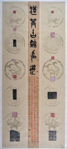 语言文化学院教师刘群指导、学生杨浩苒书法篆刻作品《浩苒古玺印选》所制印屏采用瓦当彩宣,以篆书题签,以朱砂小楷作记。刀法上冲刀直入,冲切结合,笔墨情趣与金石味道交融;用功布篆,分红布白,章法开合,表现古朴静雅,赏心悦目的艺术效果。