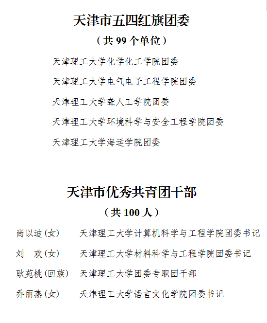 近日,团市委发布了《关于表彰“天津市五四红旗团委(团支部)”“天津市优秀共青团员”“天津市优秀共青团干部”的决定》,旨在表彰先进,树立楷模,鼓舞斗志,激励各级团组织和广大团员、团干部学习先进、奋发有为、攻坚克难,发挥先锋模范作用。我校化学化工学院团委、电气电子工程学院团委、聋人工学院团委、环境科学与安全工程学院团委、海运学院团委共5个学院团委荣获“天津市五四红旗团委”称号,计算机科学与工程学院团委书记尚以迪、材料科学与工程学院团委书记刘欢、语言文化学院团委书记乔丽燕、校团委专职团干部耿苑桃共4名同志荣获“天津市优秀共青团干部”称号。