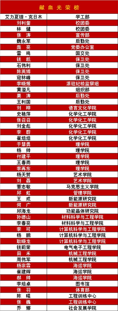 献血现场,老师们的脸上洋溢着满足的笑容,切身感受到了爱心奉献带来的温暖与幸福。在轻松愉快的氛围中,完成了无偿献血这一光荣之举。理学院的于慧勇老师第六次参加无偿献血;机关的回建东距离上次献血不到半年又一次登上了献血车;海运学院的海归博士郝帅将这次献血当作自己的“入职礼”……材料学院李春亮老师,刚刚整理完实验数据就匆匆赶来,和他一同献血的是在我校化学化工学院工作的爱人李蔚,他们把“家风”融入到爱心事业。献血现场除了“夫妻档”还有“亲子档”,艺术学院的杨天贺老师和化学化工学院的刘金彪老师都把孩子带到了现场,身体力行为孩子树立无私奉献的榜样。