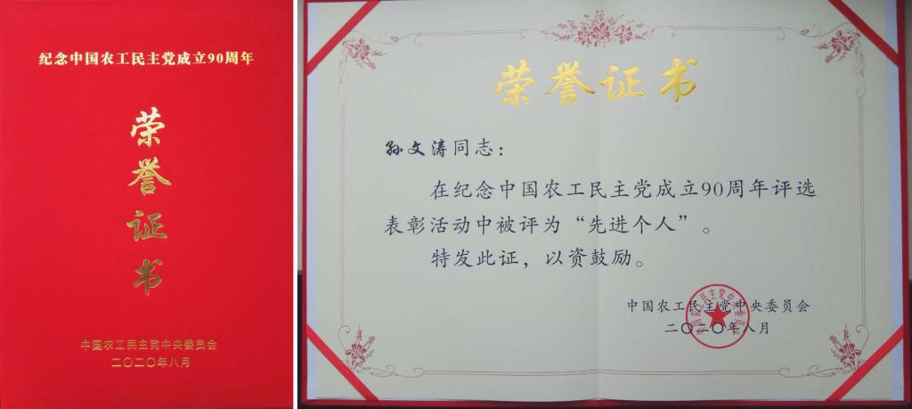 纪念中国农工民主党成立九十周年表彰大会日前在北京召开。会上对农工民主党全国先进基层组织和先进个人进行了表彰。我校农工民主党党员孙文涛荣获“先进个人”荣誉称号。