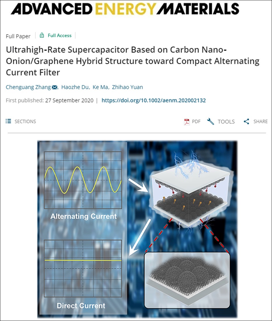 该研究成果以题为“Ultrahigh-rate supercapacitor based on carbon nano-onion/graphene hybrid structure toward compact alternating current filter”发表在专业领域国际顶级期刊Advanced Energy Materials (影响因子为25.245,DOI:10.1002/aenm.202002132;全文链接:https://onlinelibrary.wiley.com/doi/10.1002/aenm.202002132) 上。Advanced Energy Materials期刊是材料科学领域具有重要影响力的高质量学术期刊,主要从材料的视角关注能源的研究,报道与材料能源领域相关的顶尖的科研成果,对成果的创新性要求非常高。