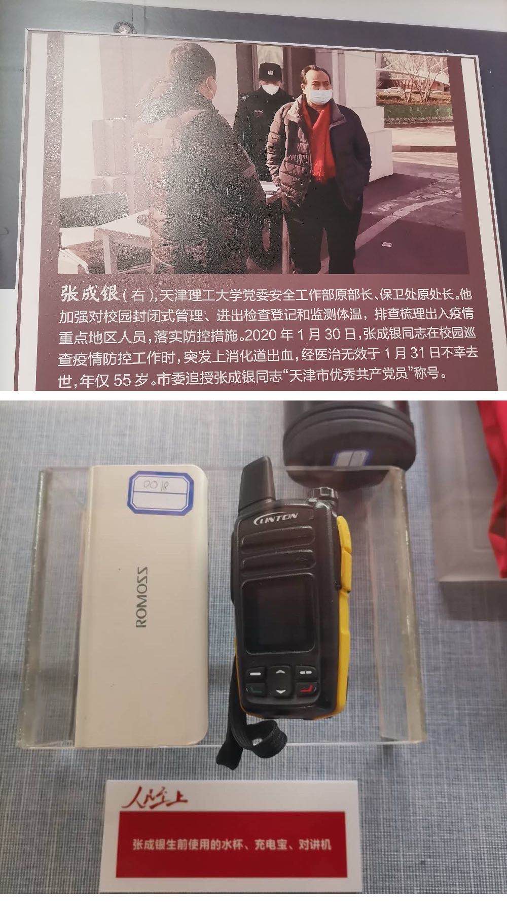展览中陈列着我校党委原安全工作部部长、保卫处处长张成银同志生前在校园疫情防控第一线使用过的的珍贵实物,记录和保存了张成银同志身为一名党员、干部不顾自身安危,冲在抗疫前线,坚于职守的责任担当。