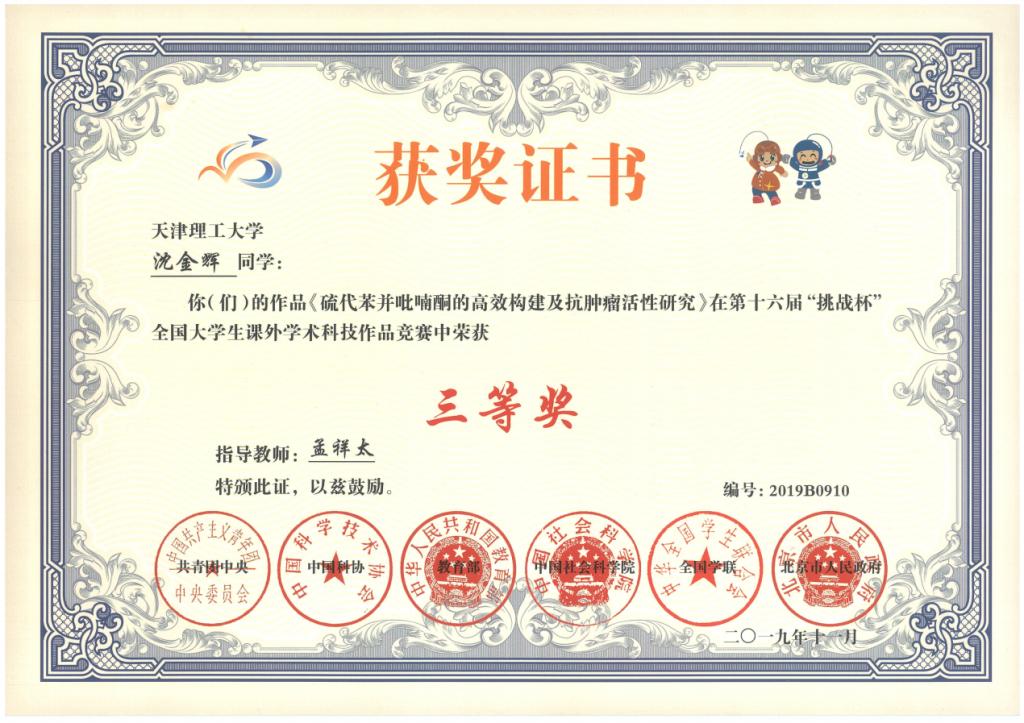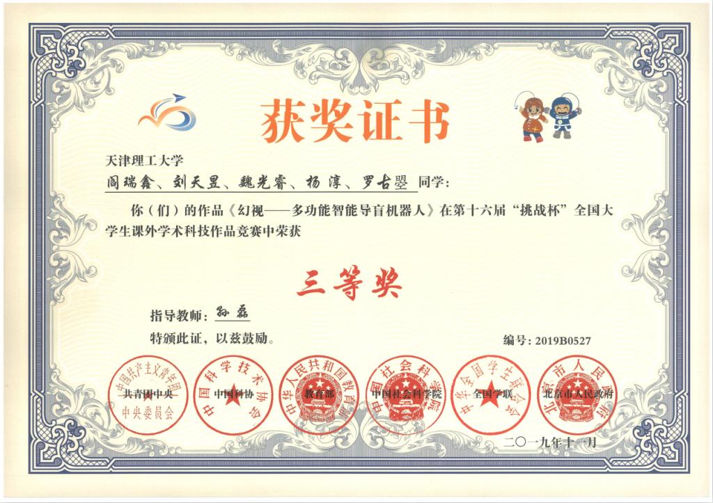 近日,由共青团中央、中国科协、教育部、中国社科院、全国学联和北京市政府主办,北京航空航天大学承办的第十六届“挑战杯”全国大学生课外学术科技作品竞赛终审决赛落下帷幕。我校电气电子工程学院闫瑞鑫团队作品《幻视--多功能智能导盲机器人》(指导教师:孙磊)和化学化工学院沈金辉作品《硫代苯并吡喃酮的高效构建及抗肿瘤活性研究》(指导教师:孟祥太)喜获决赛三等奖。