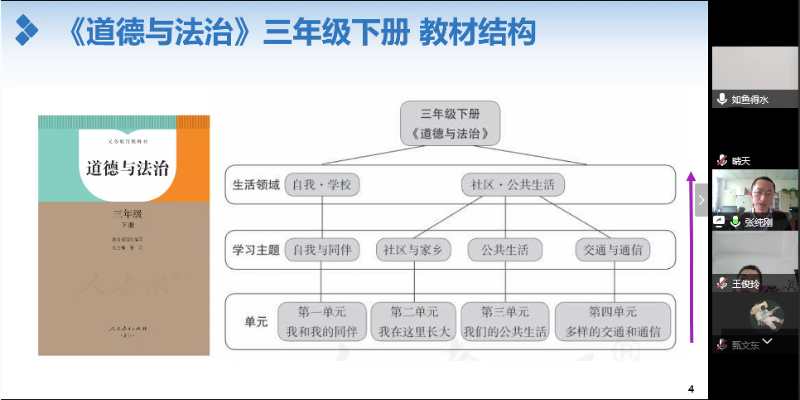 针对小学思政课教学资源相对薄弱的实际情况,我校杨凡、张纯刚和邢巍巍三名老师围绕小学《道德与法制》课程,分别从宏观、微观层面展示各年级的思政教学方法,并进行案例介绍。