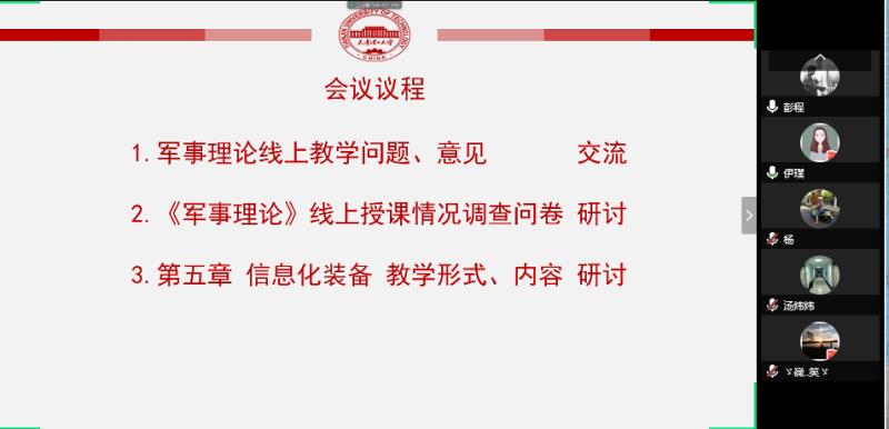 为贯彻落实本科教育大会精神,提升教育教学质量水平,确保疫情期间“停课不停学,学习不延期”,我校《军事理论》课教学团队自2月17日正式启动线上教学,并于3月15日开展了为期2周的线上教研工作。通过分组精备精讲、导师跟踪听课、发放电子问卷、问题交流研讨等环节,确保课程质量和教学效果。