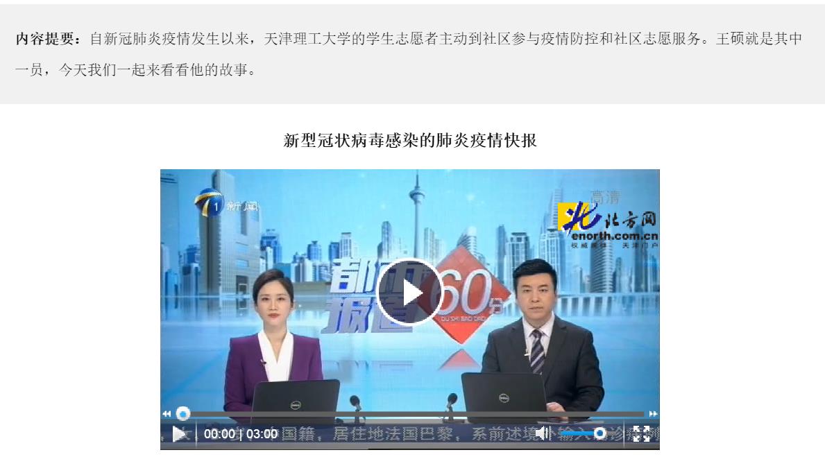 王硕,是环境科学与安全工程学院18级资源循环科学与工程专业1班的学生。他的母亲作为蓟州区人民医院的医护工作者,2月9日加入到天津市第五批援鄂医疗队,赴武汉江岸区方舱医院工作,目前仍然坚守在抗疫第一线,投入到了武汉协和医院重症病区的护理工作中。从2月14日起,王硕就投身蓟州区阳光社区的防控志愿服务工作,社区卡口执勤、居委会服务……他用真诚的服务践行着青年志愿者的誓言。3月23日天津电视台新闻频道《都市报道60分》栏目报道了他的事迹。