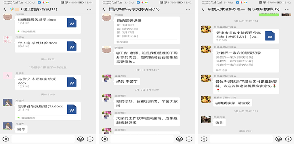 我校社会发展学院社会工作系的师生们认真学习贯彻总书记重要讲话精神,自发组成志愿服务团队,参加了由中国社会工作教育协会(学校与青少年专委会、家庭专委会、医务专委会)、中央团校等专业机构和高校资源联合天津市河东团区委组建的“暖心团”抗“疫”服务。