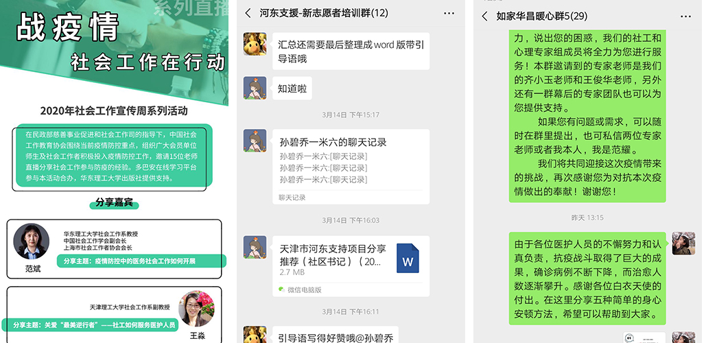 社会发展学院社会工作系的师生志愿服务团队由社会工作专业部分教师及硕士研究生(MSW)组成,共计12人,主要负责心理与情绪舒缓、家庭关系构建、与隔离居民的沟通并协助舒缓其压力等方面方法和技巧的整理、推送,第一时间通过微信群为一线医护人员提供心理支援服务,服务的人群主要包括10个留观点的医护人员和社区书记们,共计120余人。部分老师通过热线电话,面向全市的医护人员和社区工作人员、居民等提供电话咨询服务。