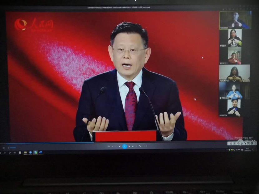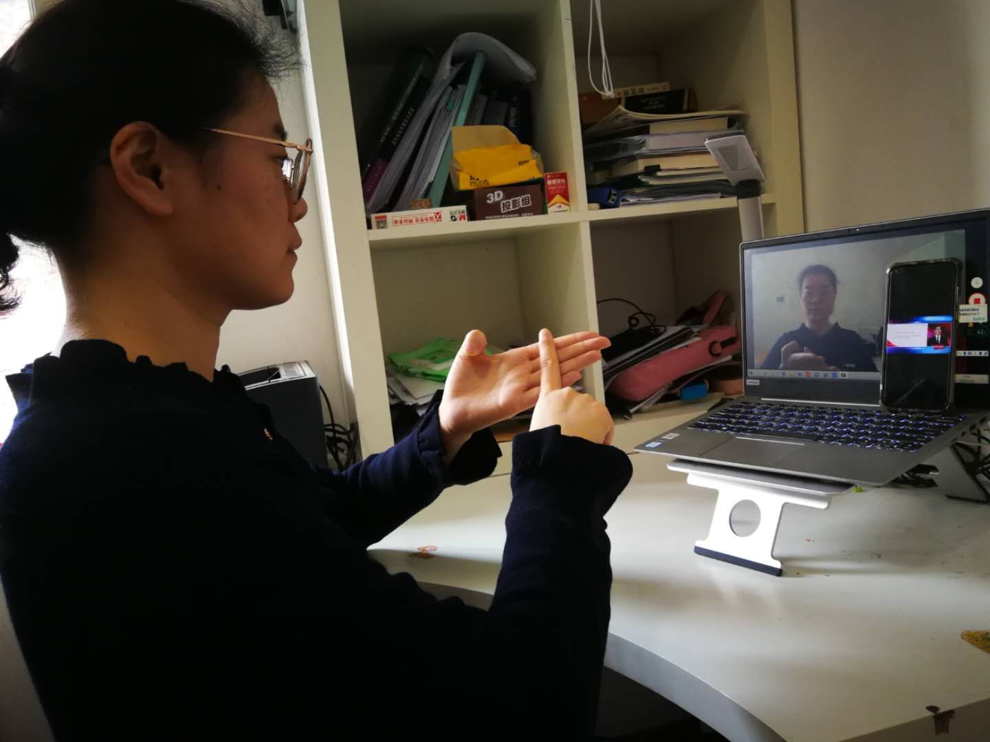 开云官方在线入口的教师、听障学生开展了多次的研讨和试译。马克思主义学院杨丽英教授解析新名词新概念的含义,聋人工学院思政课教师王晓鸥、吴杨,国家通用手语培训教师李子刚以及听障学生党员梁一帆共同商讨,不断尝试,确定了含义准确的手势。为克服四位专家教师的授课语速和手语翻译速度的差异,保证同步翻译,聋人工学院组织李子刚、吴杨、王晓鸥三位骨干翻译老师进行突击手语培训和试译练习。