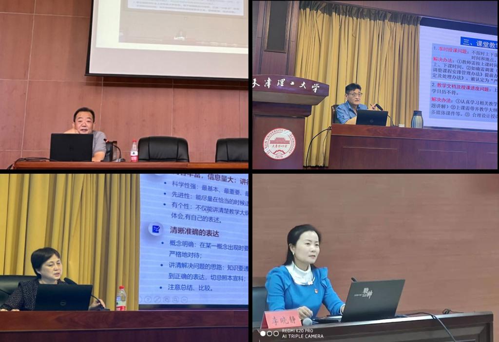 教学督导组吕联荣教授、由臣副教授,计算机科学与工程学院戴敏教授,电气工程与自动化学院李晓静教授,分别围绕教案和讲义等教学材料撰写要点、课堂教学注意事项、名师之路、如何上好一门课等内容作专题报告。吕联荣以《新形势下高校教师的自我建设》为题,围绕高等教育新形势、教师自身建设、OBE理念以及教学文件等方面作专题培训,并解读了《教育强国建设背景下高等教育质量发展》报告,深入阐述“培养目标、毕业要求、课程体系、课程目标、教学内容、考核内容”等OBE理念。由臣以《高等教育发展概貌及本科教学规范化》为题,阐述了高等教育改革发展新部署新要求、高等教育发展面临的新形势新挑战,介绍了教育部新一轮普通高等学校本科教育教学审核评估及学校相关教学文件要求,分享了其在教学督导工作中发现的问题,要求广大教师要规范教育教学、提高教育质量,提升育人实效。戴敏以《教学匠心 共筑成长梦》为题,从教师角色认知与定位、教学设计与方法创新、课堂教学技巧、师生关系与课堂管理、教学研究与教学改革五个方面,分享教学经验、方法和技巧,指出课堂教学要常讲常新、要严格管理学生、要勇于教学创新。李晓静以《“新”光熠熠 蓄“师”待发》为题,围绕如何上好一门课,通过解读教学创新大赛对日常教学的启示,向青年教师分享了如何上好一门课的经验体会,要求新进教师充分研究岗位工作要求,结合自身兴趣与特长,确定主攻方向。