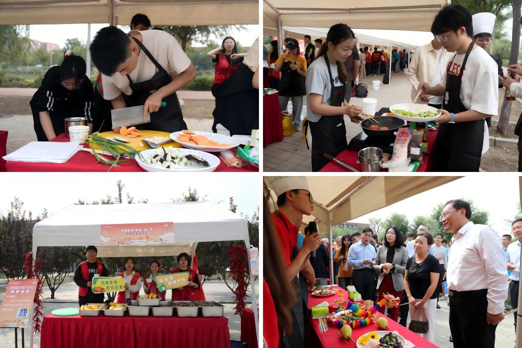 展厨艺,品美食。学校特别设计了户外厨艺大赛。各参赛队员在规定时间内相互配合,完成膳食知识竞答、冷食拼盘与特色菜品的制作。云南红三剁、拌三丝、地三鲜、青椒炒肉、烧茄子……众多佳肴各具特色、刀工精湛,展现了同学们高超的厨艺与美食创意。师生评委团现场品尝并点评,利用“明理工厂”制作的创意笔筒和书签进行投票,选出心目中的“厨王”。