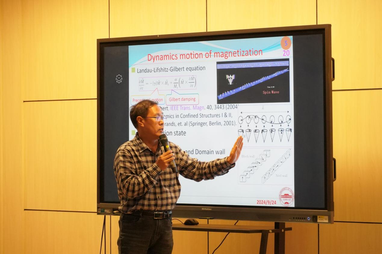 李再东以“惯性状态下的磁化强度动力学”为题,指出惯性效应可以形成磁化螺旋结构,并且可以通过惯性矩的驱动在超快磁学中获得更高的领域壁速度,相应的驱动场更小。他结合自身科研经历鼓励青年教师要提高自身发现问题,解决问题的能力,扎实做好科研工作。