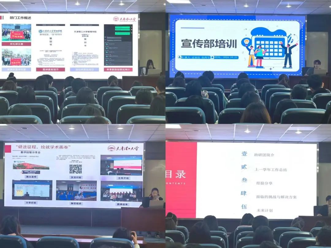 培训会上全员集中学习了系列相关文件。同时开展各部门工作培训,负责人向与会学生讲述学术活动策划成果、相互借鉴管理经验、学习新媒体应用、探讨社会实践心得等内容,帮助新一届研究生会干事尽快适应角色、发挥自身潜力,推动学院事业高质量发展。