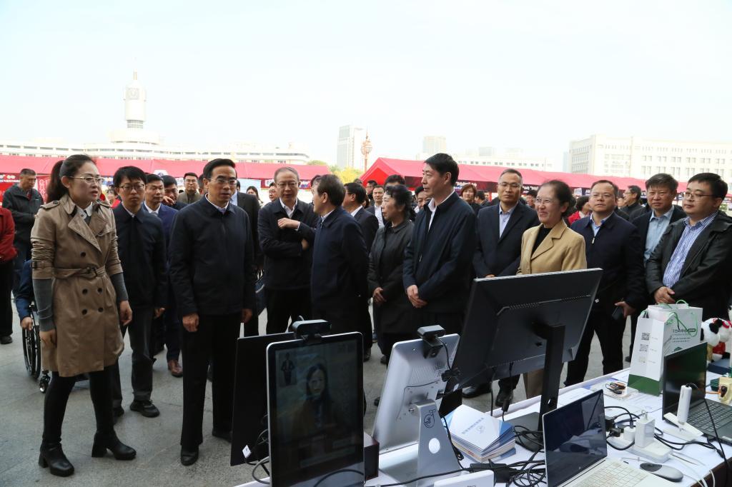 中国残联主席程凯来到科技助残项目展位前,对依托学校科研平台开发的鲸言智能手语翻译系统表示肯定。他希望该项目团队能够尽快将项目产品优化迭代和落地应用,成为聋人日常使用的无障碍交流、沟通工具。