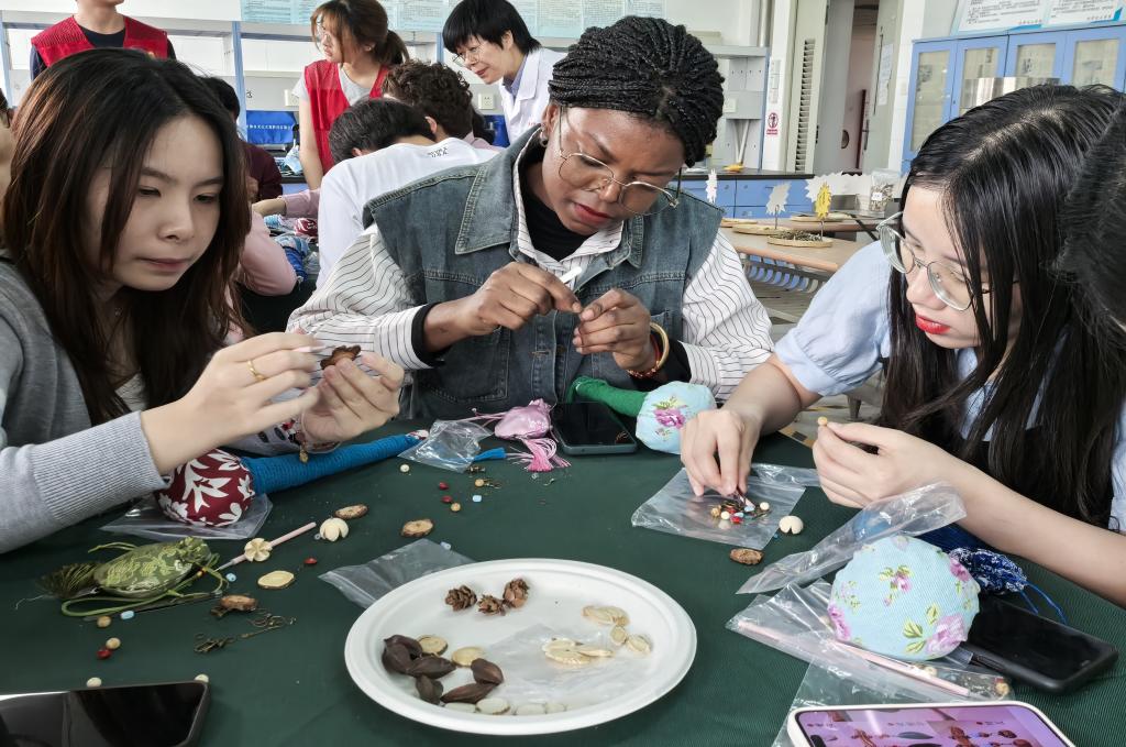 在沉浸式手工体验环节,留学生们分组参与了养生锤制作、中药香囊DIY和中药耳饰创作等活动。在老师和志愿者的指导下,他们根据药材功效亲手挑选藿香、白芷、黄芩等草本原料,精心制作专属养生锤、香囊和耳饰,体验中医药的实用性与艺术性。留学生们纷纷展示养生锤、香囊、中药耳饰等作品,惊叹中医药与传统手工艺的巧妙结合。