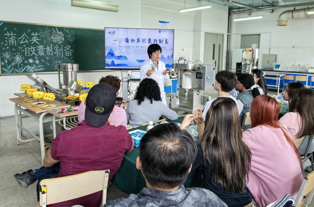在制药工程系教学实验室内,专业课教师李彩文以常见的蒲公英、艾草、陈皮等中草药为切入点,详细介绍了它们的性味、功效、炮制方法等,并生动讲解了药物的提取、分离及制备的科普知识。留学生们亲手体验蒲公英胶囊的制备,从称量原料到填充封装,直观感受中医药与现代制药技术的完美融合。