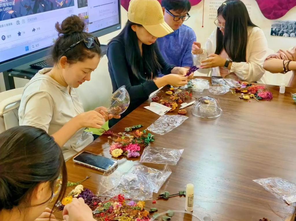 在核心创作环节,活动突破传统心理辅导模式,创新性地以塑料奶茶杯为载体,以永生干花为艺术媒介,引导参与者将抽象情绪转化为具象艺术表达。活动现场,同学们充分发挥创意,有的通过拼贴向日葵与雏菊组成笑脸图案,传递积极向上的精神风貌;有的将蓝紫色薰衣草错落排列,营造静谧深邃的内心世界;有的运用藤蔓造型的干花,表达对生命成长的思考感悟。