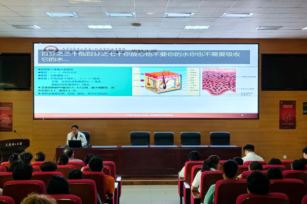 健康讲座中,西青区中医医院皮肤科主任王萍为师生们详细讲解了痤疮、脱发等常见问题的防治知识,并讲授了简单的按摩和运动方法,现场气氛热烈。