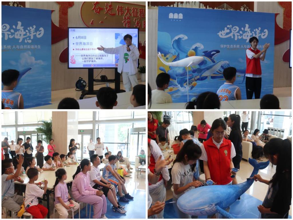 活动现场,学生志愿者以《守护蓝色星球》为主题,为小朋友和家长们科普海洋知识。他们从海洋环境污染、海洋资源、海洋生物等三个方面详细讲解了海洋环境的相关知识与现状,并带领小朋友们探索海洋奥秘,宣传保护海洋环境的重要性。在互动环节,通过设置互动小游戏及海洋环保知识问答等环节,以激发大家对海洋的好奇与热爱。志愿者引导现场人员共同完成鲸鱼立体涂鸦,画出自己心中的美丽海洋,并号召大家身体力行,共同守护蔚蓝海洋的生态之美。