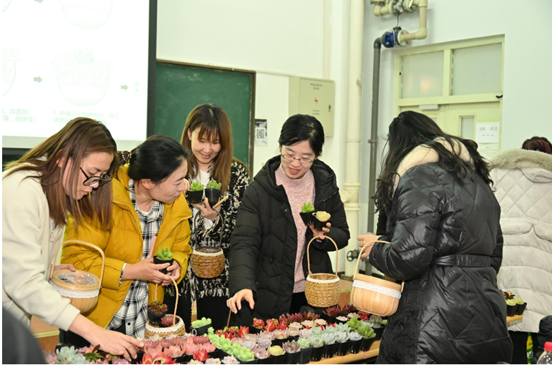 活动中,学院教师陈冰晶为大家讲解了植物特性、盆栽组合、工具材料、操作步骤和色彩搭配等注意事项。各位女教职工踊跃参与,全情投入,现场气氛和谐融洽。