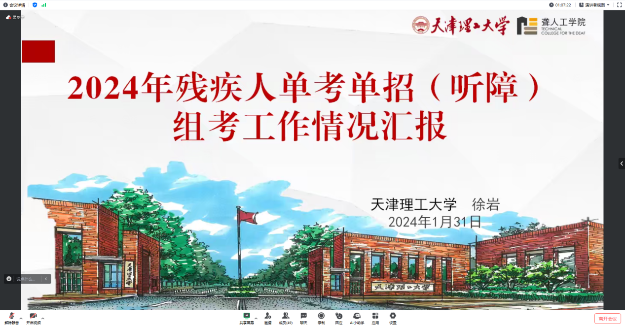 近日,受中国残联教育就业部委托,中国高等教育学会特殊教育研究分会通过线上方式召开2024年普通高校残疾人单考单招工作研讨会。中国残联教育就业部、教育部高校学生司、基础教育司、教育部考试院以及中国高等教育学会特殊教育研究分会有关负责同志出席会议,并就2024年残疾人单考单招工作的规范性、公正性、安全性等作出具体指导和要求。我校聋人工学院相关负责同志就我校2024年残疾人单考单招组考准备工作进行了汇报发言。