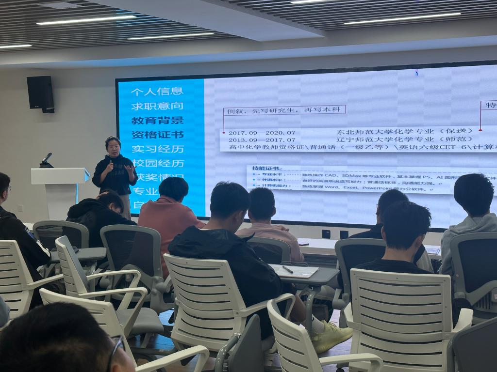 辅导员结合当前就业形势,围绕简历撰写制作,从认识简历、制作简历到投递简历展开,主要从个人信息、求职意向、教育背景、资格证书、实习经历、校园经历、获奖情况、专业技能、自我评价等九个方面讲解“如何制作一份亮眼的简历”。讲座结束后,辅导员对参会毕业生简历进行了“一对一”的诊断与精修。