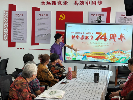 志愿者为社区中老年群体进行手机课堂科普,指导老年人使用手机支付、打车、购物、地图等基本功能,让老年人和时代接轨,感受信息化时代的便捷与美好。青马学员与社区居民分享中秋节的起源和典故,并通过故事和诗句的形式生动描绘中秋佳节的民间习俗。学生党员结合国庆主题,从忆往昔岁月、看今朝成就、新征程使命三个方面出发,同社区居民共同回顾沧桑岁月、展望美好明天。同学们还与老人们同唱歌曲,唱出了当代青年学子昂扬向上的精神状态,也唱出了新时代的幸福生活。
