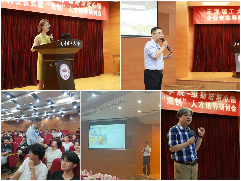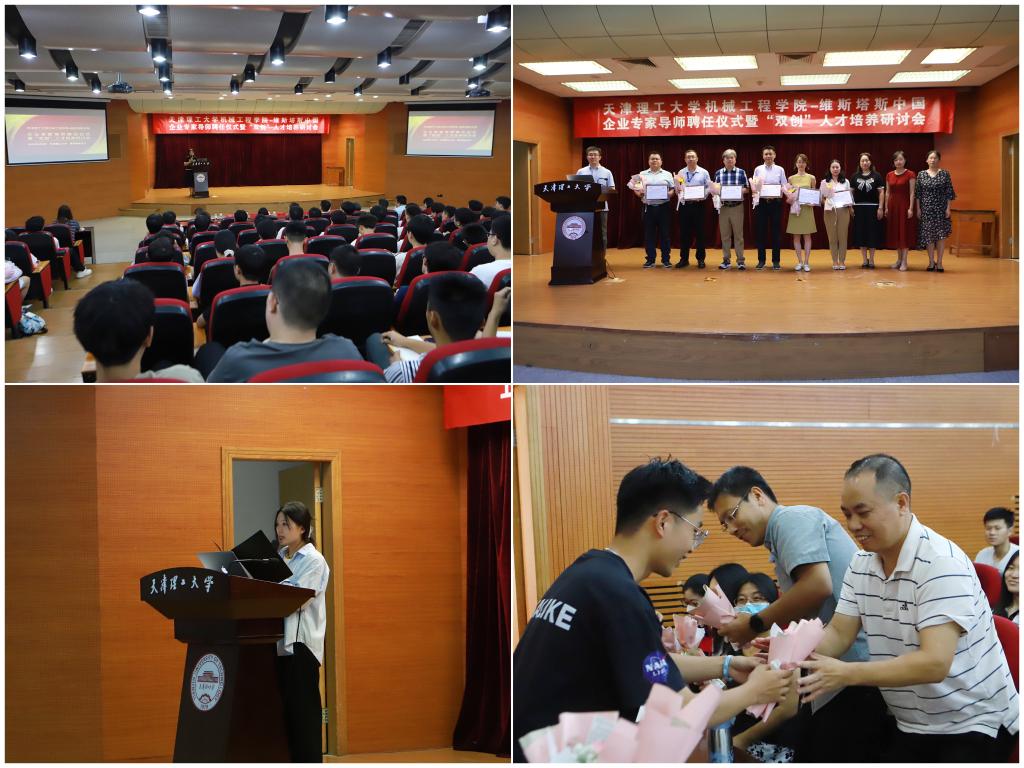 会上,学院党委相关负责人回顾了学院发展历程和双方在“双创”人才培养方面的合作经历,介绍了学院人才培养理念与创新举措,并指出,学院以“党建+”为抓手,充分发挥优质企业和优秀专家的作用,深度参与课程设计、实习实践、生涯规划等方面工作,取得了良好成效,希望能够以此次活动为契机,进一步探索面向高等教育创新、面向“双创”人才培养、面向企业高质量发展等多方需求的产教融合新样板,为行业和社会输送更多卓越工程科技人才。随后,学院相关负责人为受聘企业导师颁发聘书,维斯塔斯天津机舱工厂相关负责人代表企业导师发言,2021级能源与动力工程专业学生代表发言,并为与会教师代表和企业导师献上鲜花表达祝福。