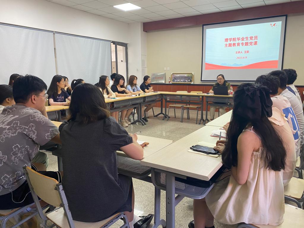 为深入开展学习贯彻习近平新时代中国特色社会主义思想主题教育,进一步做好毕业生党员教育管理工作,引导和鼓励广大毕业生党员坚定理想信念、提高政治意识,发挥好党员先锋模范作用,以饱满的青春热情、良好的精神风貌踏上人生新征程,日前,理学院在10号楼106会议室组织开展2023届毕业生党员主题教育专题党课,由院党委书记王茹担任主讲,全体2023届毕业生党员参加。