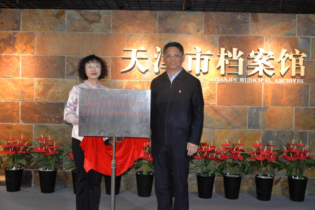 马克思主义学院院长杨莲霞和天津市档案馆宣传部主任冯宏为爱国主义教育实践基地揭牌,交换共建协议。