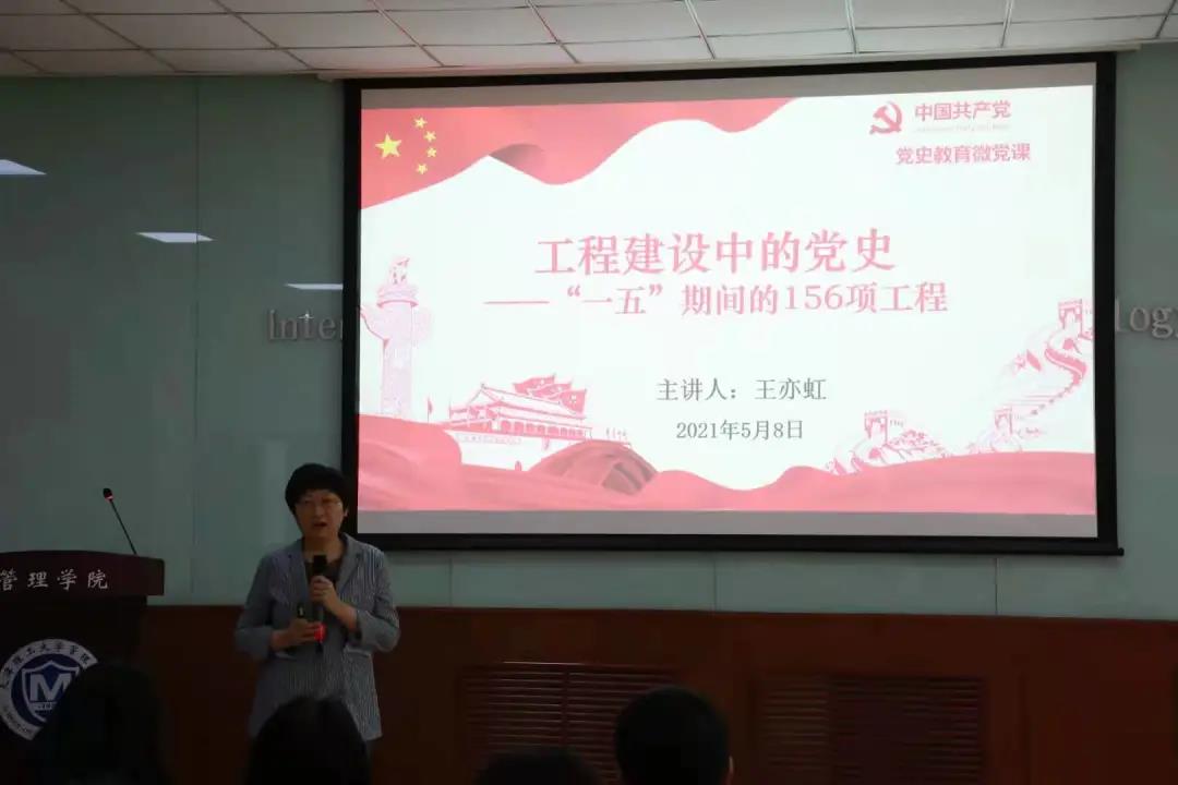 工程管理教工党支部书记王亦虹以“工程建设中的党史”为题进行了微党课授课,通过“一五”时期156项工程的筹建背景、建设历程,带领大家回顾了“共和国工业长子”诞生的辉煌历史,使老师和同学们深刻感悟到我国社会主义制度集中力量办大事的巨大优越性,更加坚定了对党的领导的自信。
