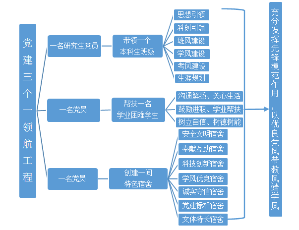 培优建树,以优良党风带教风端学风。学院党委实施学生党建“三个一”领航工程,即一名研究生党员带好一个本科生班级、一名党员创建一间特色宿舍、一名党员帮扶一名学业困难学生。领航工程党员定期开展理论宣讲、学风调研、学术报告、交流座谈、宿舍走访等活动,真正为周围师生做实事做好事,以优良的党风带教风端学凤,推动学院整体工作实效。现已成功对接116个班级,帮扶120名学业困难学生,涵盖52间特色宿舍。通过实践活动全方位立体化推动学生党员再教育,健全学生党员培养机制,推动实现“树旗帜、亮身份、作表率、促发展”,充分发挥学生党员先锋模范作用。