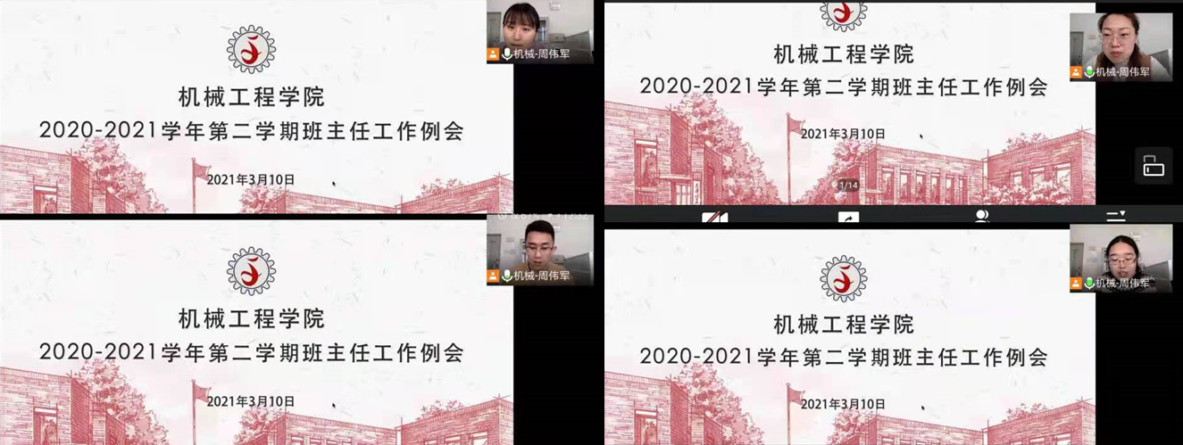 展望新学期、站在新起点、肩负新任务、打造新气象。为明确班主任工作任务,进一步增强班级管理工作的靶向性和实效性,提高学院学生培养质量和班级管理水平,机械工程学院于3月10日召开了班主任工作线上会议。会议由学院党委副书记周伟军主持,全院各年级班主任和辅导员参加了本次会议。