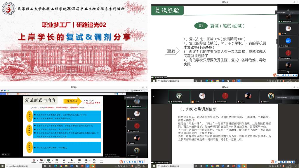 为帮助2021届毕业年级考研学生更有效地准备研究生复试,3月7日,机械工程学院召开“研路追光”云端考研复试经验分享会,邀请2020届优秀学生代表与考生交流面试及调剂经验,2021届部分考研学生、相关辅导员参加交流会。