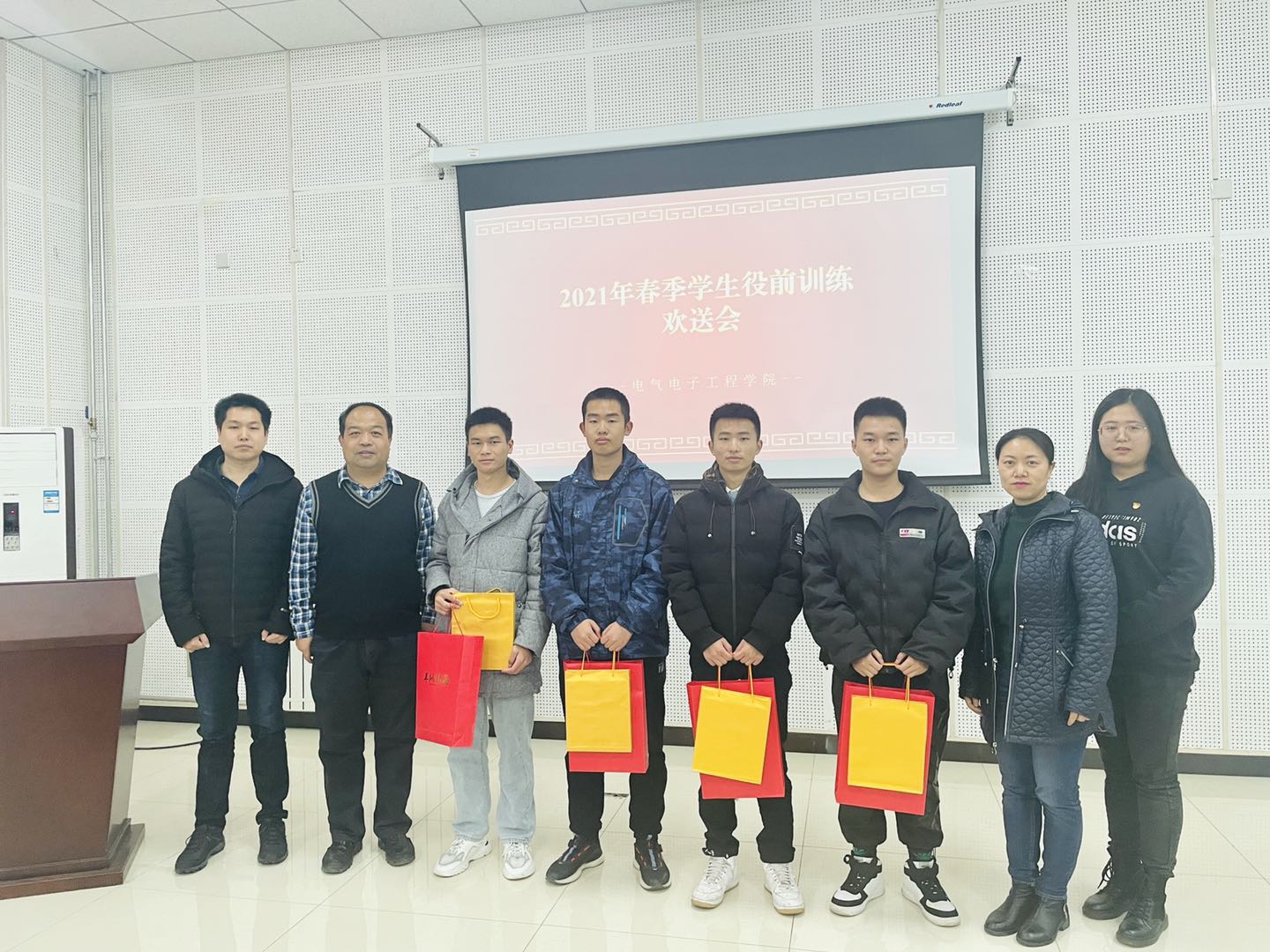 会后,学院为四名学生送上纪念品,并合影留念。据悉,电气电子工程学院将持续做好征兵动员工作,为国家输送更多优秀人才。