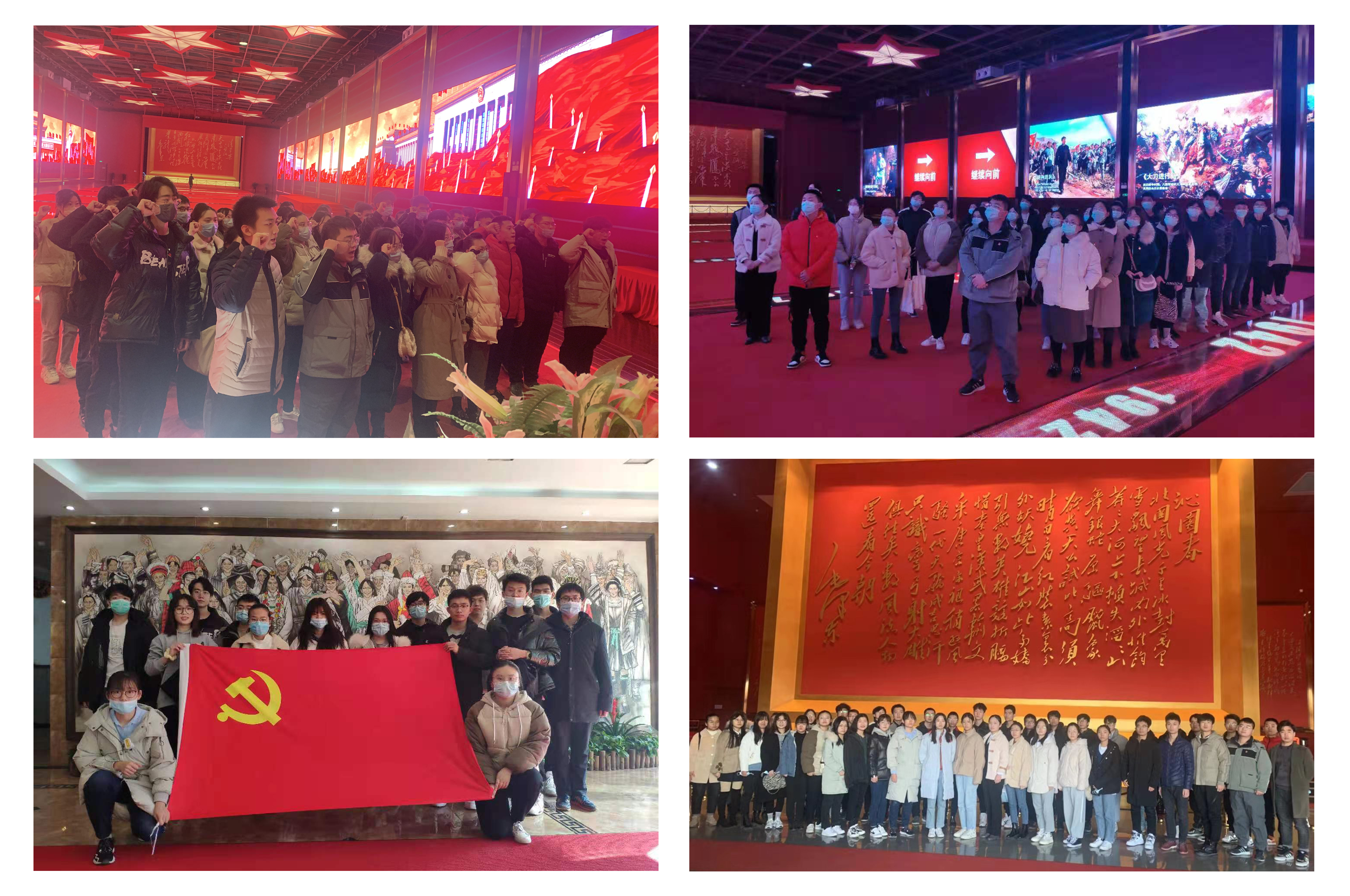 一行人在讲解员的带领下,缓缓步入时空殿堂。随着雄壮的音乐声响起,大屏上出现珍贵的历史画卷,将大家的思绪带回到1921年。置身在画面的革命情景中,亲身感受在外来侵略寇急祸重的严峻形势下,各族人民手挽手、肩并肩,英勇奋斗,浴血奋战,捍卫着民族独立和自由,共同书写中华民族保卫祖国、抵御外侮的壮丽史诗。走过1921年到1949年,在时空殿堂的尽头,一行人高高举起右拳,重温入党誓词,铮铮誓言喊出大家探寻革命先辈的优良作风,传承共产党人的精神传统的决心与信心。