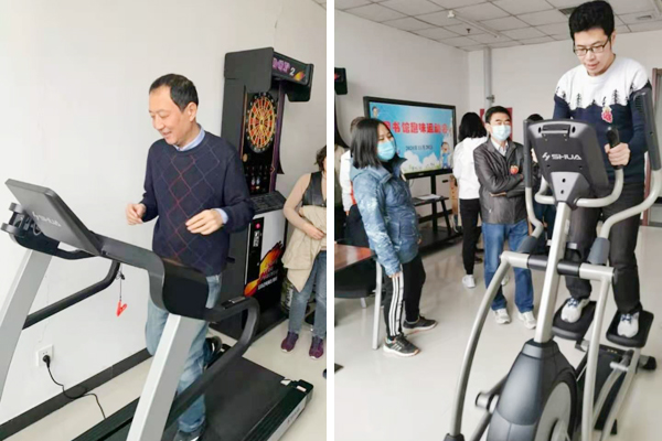 跑步机计时赛和椭圆机计时赛中,均以三分钟为限,按跑步距离记成绩。馆员们根据各自身体状况,选择自己合适的跑步速度,挥洒汗水,奋力拼搏。