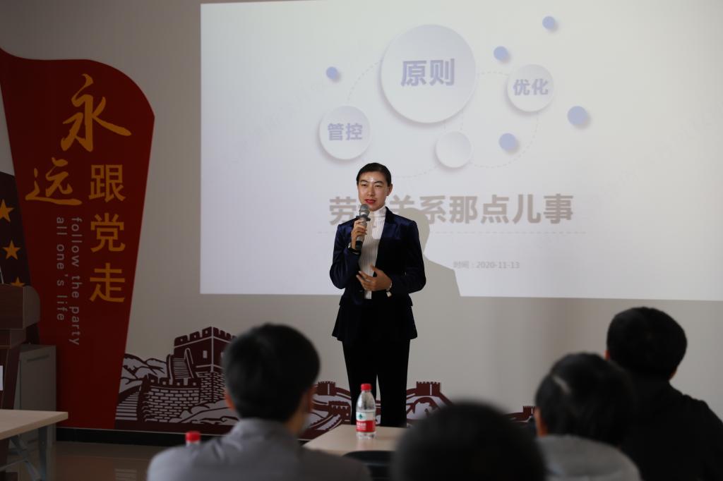 国家二级人力资源管理师、高级风控咨询师景丹老师以《劳动关系那点儿事儿》为题向同学们讲授了职涯规划与人力风险规避原则等内容,并结合案例分析,提醒学生在求职过程中避免可能出现的陷阱和问题。