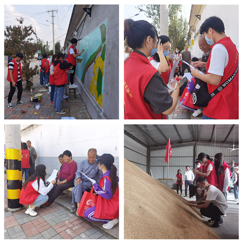 参观学习过后,团队分两组开展党日实践活动,第一组投入到创作《杜绝舌尖上的浪费》主题公益宣传画中,同学们充分发挥自身专业特长完成画作,在宣传节约粮食的同时也为村庄增添了一处靓丽景色;第二分队就“美丽乡村建设”进行走访调研,同学们结合自身专业,将村民对于美好乡村建设的希冀设计于问卷当中,为今后的课题研究提供数据支持。最后,实践团一行参观了尔王庄粮食生产基地,了解当地的农业产品扶贫项目的开发模式,通过实地参观让学生党员感知了粮食的来之不易。