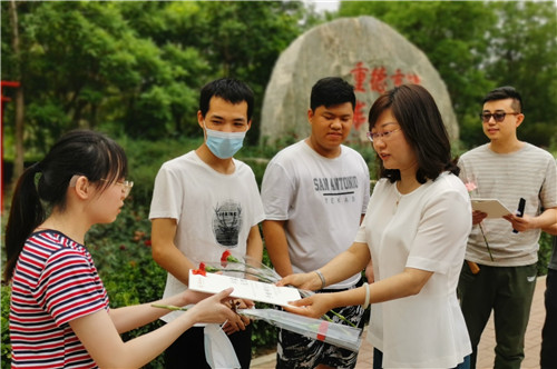 活动过程中,学院领导老师在校训石下为听障生送上精心准备的手绘“天理印象”明信片,希望他们牢记“重德重能 求实求新”的校训,在未来岗位上积极创新,不断超越自我,实现梦想。毕业生也为领导老师送上康乃馨,感谢老师们四年的辛勤培育,祝愿母校桃李满天下。