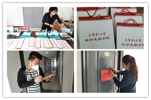 学院相关负责同志分别带领辅导员们走近宿舍看望返校毕业生,悉心询问大家返校后的适应程度和身体情况,叮嘱同学们做好防护措施,在不放松防“疫”举措的前提下搞论文、谋职业。老师们现场对毕业生论文撰写进度和复试就业情况进行了解、答疑解惑,并为已返校的学生发放毕业小礼包,口罩、纸巾、酒精消毒湿巾等防疫物资寓意“毕业生平安”,笔记本等学习生活用品寄语“毕业生学业顺利”,其中更有特地为毕业生精心准备的母校建筑徽章作为离校纪念,期待毕业生们在短暂母校时光中感受细致的服务和学院的温暖。