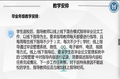 方案要求,各专业要统筹开展疫情防控和本科教学工作,授课教师因时制宜调整教学计划,做好辅导答疑,根据疫情防控进展合理采用在线教学与线下教学相结合的方式,保障特殊时期教学工作的连续性。毕业班指导教师须密切关注学生毕业论文进展情况,采用线上线下混合模式开展论文指导工作。对于特殊原因不能返校的学生,指导教师应适当增加线上指导时间,实现“指导形式多样化、论文质量不打折、工作进度不延误”的工作目标,确保毕业生按时保质完成学业。