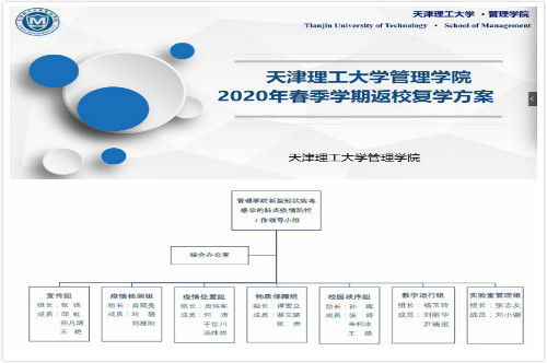 学院深入贯彻学校疫情工作领导小组会议精神,依据学校工作部署制定《管理学院复课开学疫情防控方案》(津理工管理学院党〔2020〕3 号),进一步细化人员分工安排,成立师生党员志愿者突击队,充分发挥党员先锋带头作用,在宣传动员、返校准备、接站服务、日常监测、卫生通风、校园秩序、网络动态等方面协助学院开展相关工作,全面做好我院本科生、研究生复课开学疫情防控工作,确保疫情防控科学有效,教育教学活动平稳有序。