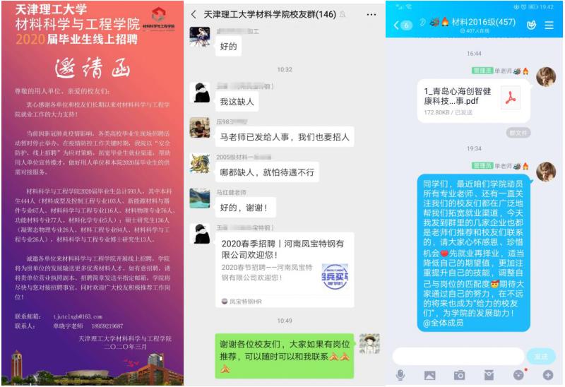 为认真贯彻国务院常务会关于鼓励吸纳高校毕业生就业的工作部署,落实学校疫情防控期间毕业生就业推动相关工作要求,材料科学与工程学院号召全体学工队伍、专业教师,动员校友资源积极行动起来,多措并举、齐心协力推动毕业生就业工作,努力为2020届毕业生就业保驾护航。